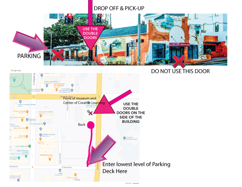 1. The designated drop off/pick up point on the lowest level of the parking deck at the back entrance to the Center for Creative Learning. Access this area via the Broome Street parking deck entrance at the bottom of the hill. Staff will be there to collect and escort children to the art studio. There is plenty of adjacent parking should you need to park and walk your child in.